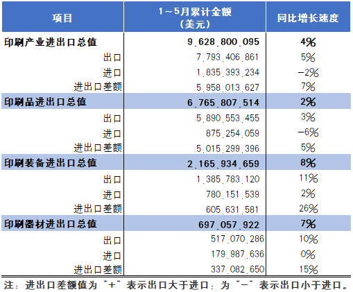 根据国家海关总署最新发布的统计数据,2024年1~5月国内印刷品、印刷装备、印刷器材进出口总值为96.29亿美元(参见表1),与去年同期相比增长4%。