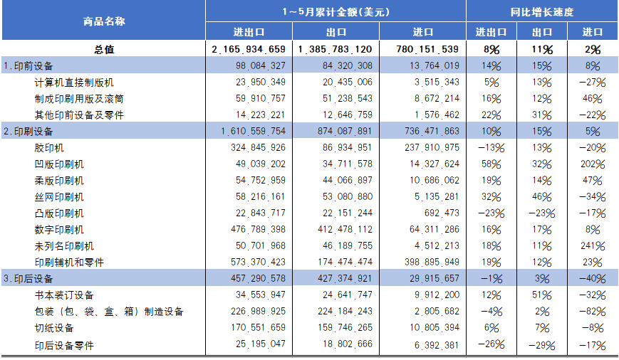同期,印刷装备主要出口品种变化:计算机直接制版机586台、2043.50万美元(同比增长13%);胶印机1835台、8693.50万美元(同比增长13%):凹版印刷机629台、3471.16万美元(同比增长32%);柔版印刷机621台、4406.69万美元(同比增长14%);丝网印刷机4.00万台、5308.09万美元(同比增长46%);凸版印刷机2777台、2215.12万美元(同比下降23%);数字印刷机48.89万台、4.12亿美元(同比增长17%);印刷辅机和零件1.74亿美元(同比增长12%);书本装订设备2464.17万美元(同比增长51%);包装制造设备2.24亿美元(同比增长2%);切纸设备1.60亿美元(同比增长7%)
