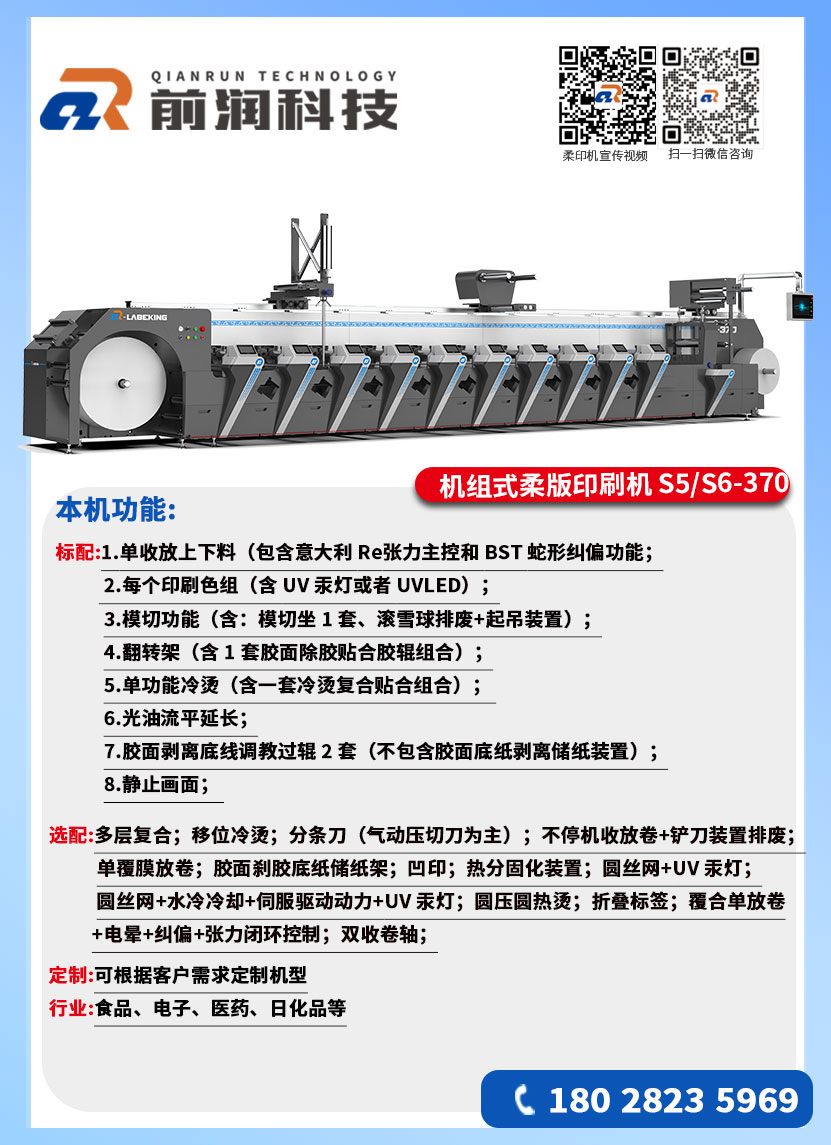 3、印刷或传墨压力调节快捷方便:印刷辊采用承载式,换辊时无须调节压力,特殊作业时最多微调。 Printing or ink transfer pressure adjustment is quick and convenient: the printing roller adopts load-bearing type, and there is no need to adjust the pressure when changing the roller. At most, fine-tuning is required for special operations. 4、智能不停机系统:可选配不停机收放卷系统,支持手动/自动接纸,提高生产效率;全视觉自动套印系统,实现自动套印和数据保存,返单时可一键调取,自动套准。 Intelligent non-stop system: optional this system, support manual/automatic paper connection, improve production efficiency; full visual automatic overprinting system, realize automatic overprinting and data storage, and can be retrieved with one button when returning the order, and automatically register. 5、多功能印刷:柔版印刷为主,支持冷烫、覆膜、除胶、多层标签、折页标签、在线品检、模切等工艺,可选配丝印、喷码、凹版等联机功能。 Multifunctional printing: mainly flexographic printing, supporting cold stamping, lamination, Glue removal, multi-layer labels, folding labels, online inspection, die-cutting and other processes, and optional online screen printing, inkjet printing, gravure, etc. |
