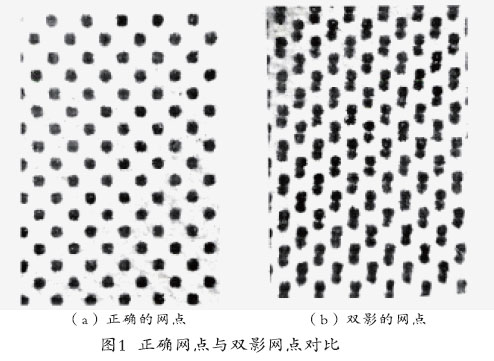 当通过100倍的放大镜或显微镜观察印品时,印刷品上15%~25%网点区域会显示出明显的双影问题。其表现是,在一个深色点子旁边出现一个浅色点子或者是深色点子与浅色点子相互搭叠(见图1)。其发生机理可以这样解释:由于油墨图文从橡皮滚筒转移到纸张上的过程中未能完全转移,在橡皮布上留下了一个浅色的可印刷图像。在下一印刷周期中,印版上转移过来的新鲜的油墨图像未能与橡皮布上残留的图像精确对准,转移到下一张纸上的图像就会形成双影。这是网目调印刷的一个令人烦恼的问题。因为每一印张上的双影情况都不相同,从而导致色彩浓淡无规律的变化。
