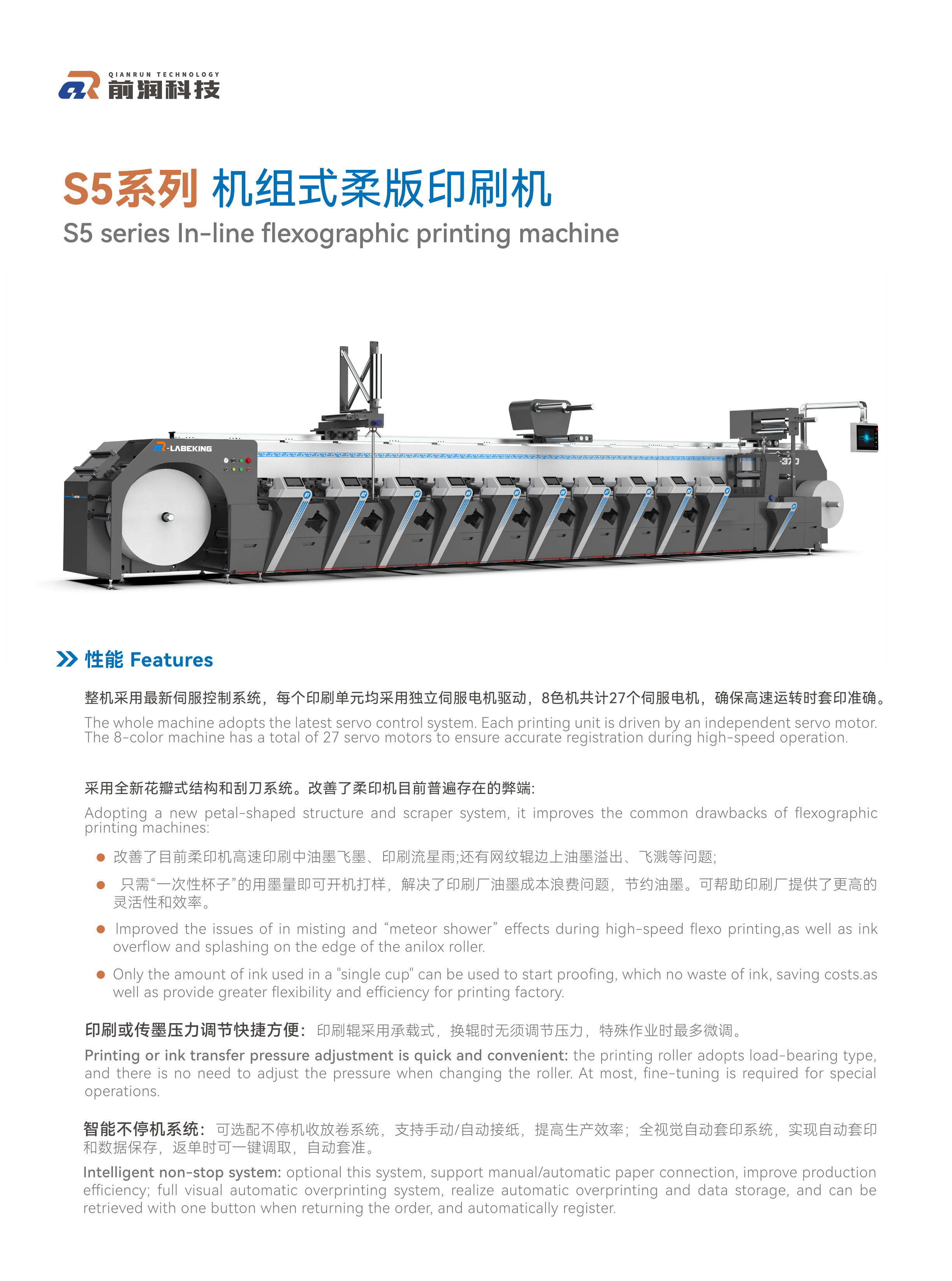 1️⃣整机采用最新伺服控制系统,每个印刷单元均采用独立伺服电机驱动,8色机共计27个伺服电机,确保高速运转时套印准确。